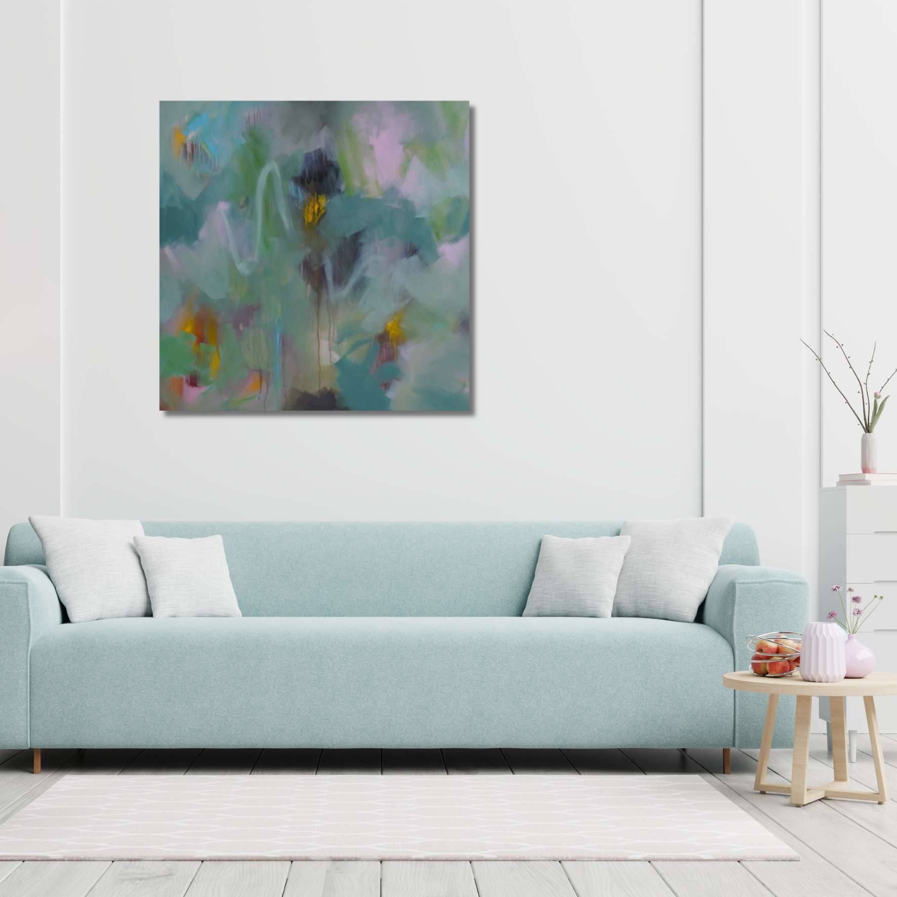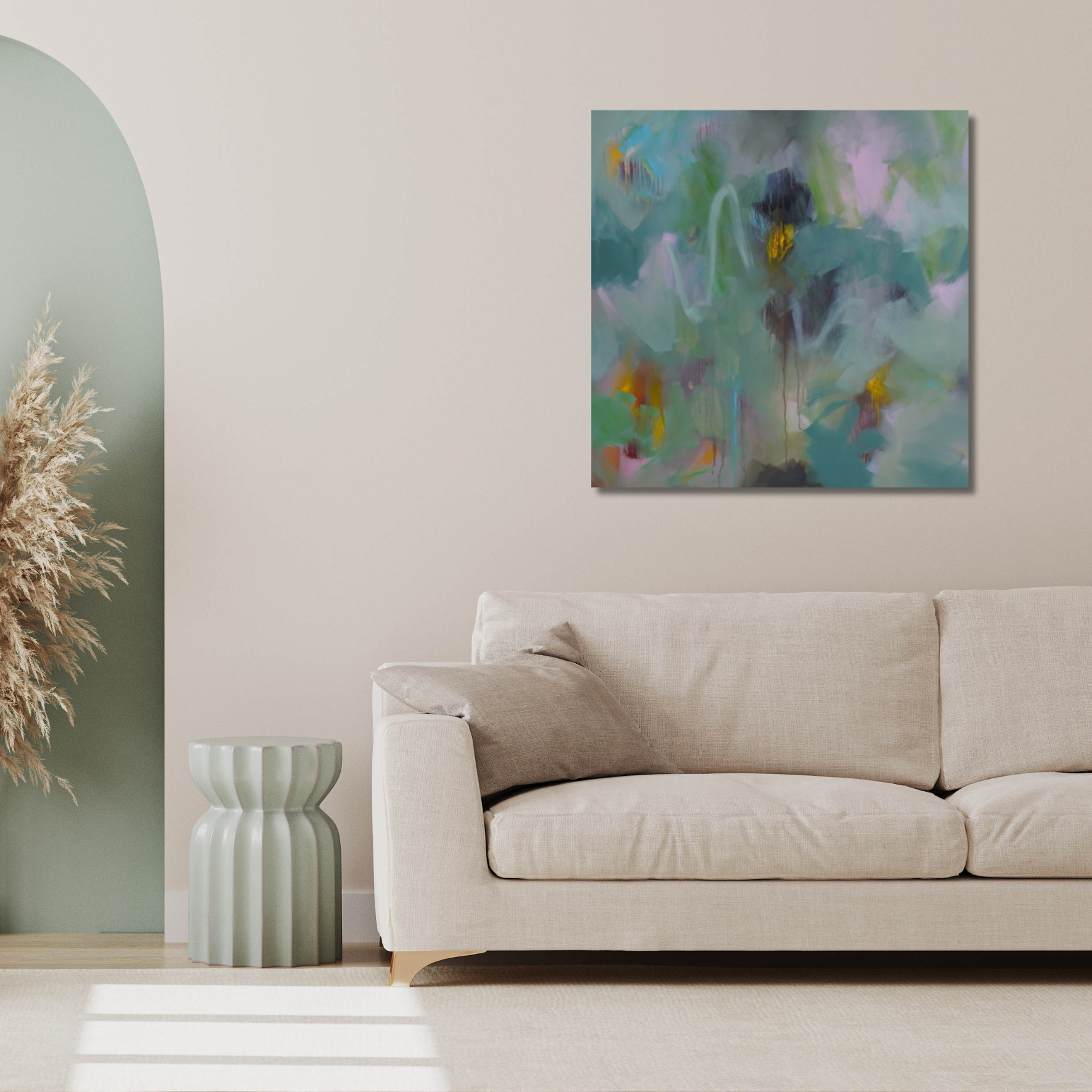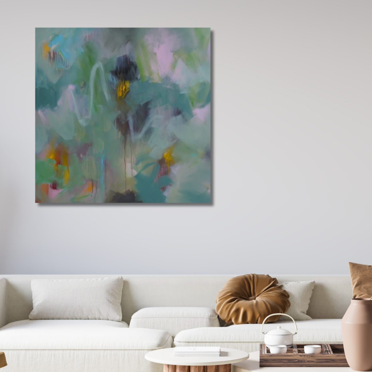 Grow, Flow is a vibrant modern abstract that celebrates movement, vitality, and joyful expansion. A lush spectrum of greens—ranging from earthy sap to luminous jade and refreshing turquoise—creates a grounding yet uplifting foundation. These verdant tones are sparked with bursts of dopamine-bright colours: sunny yellow, electric pink, vivid red, and cobalt blue. The result is a playful, kinetic composition that feels alive with possibility.