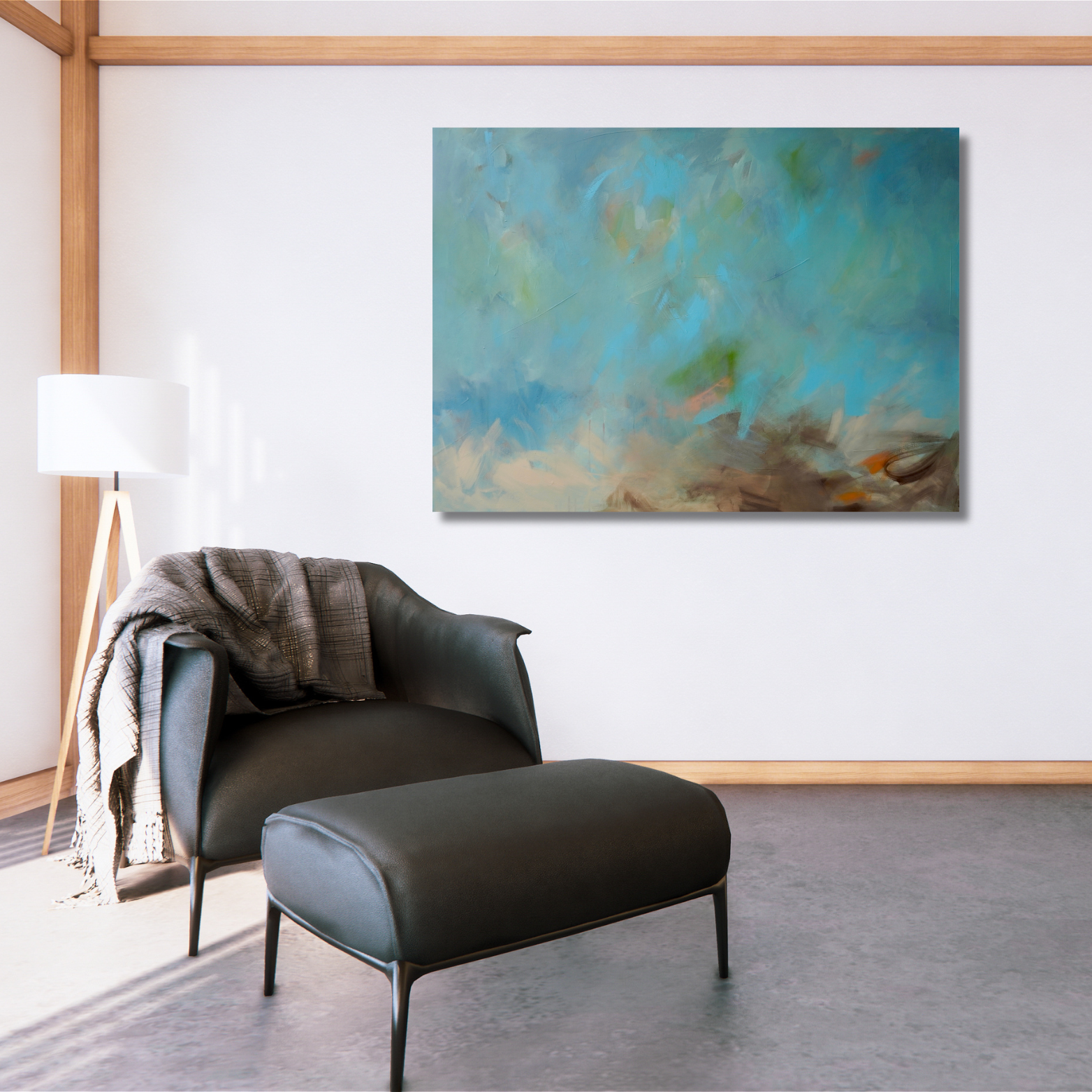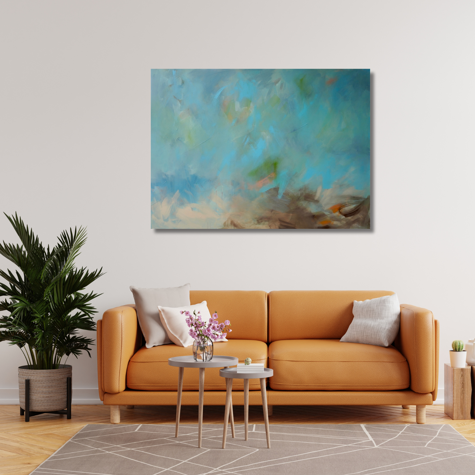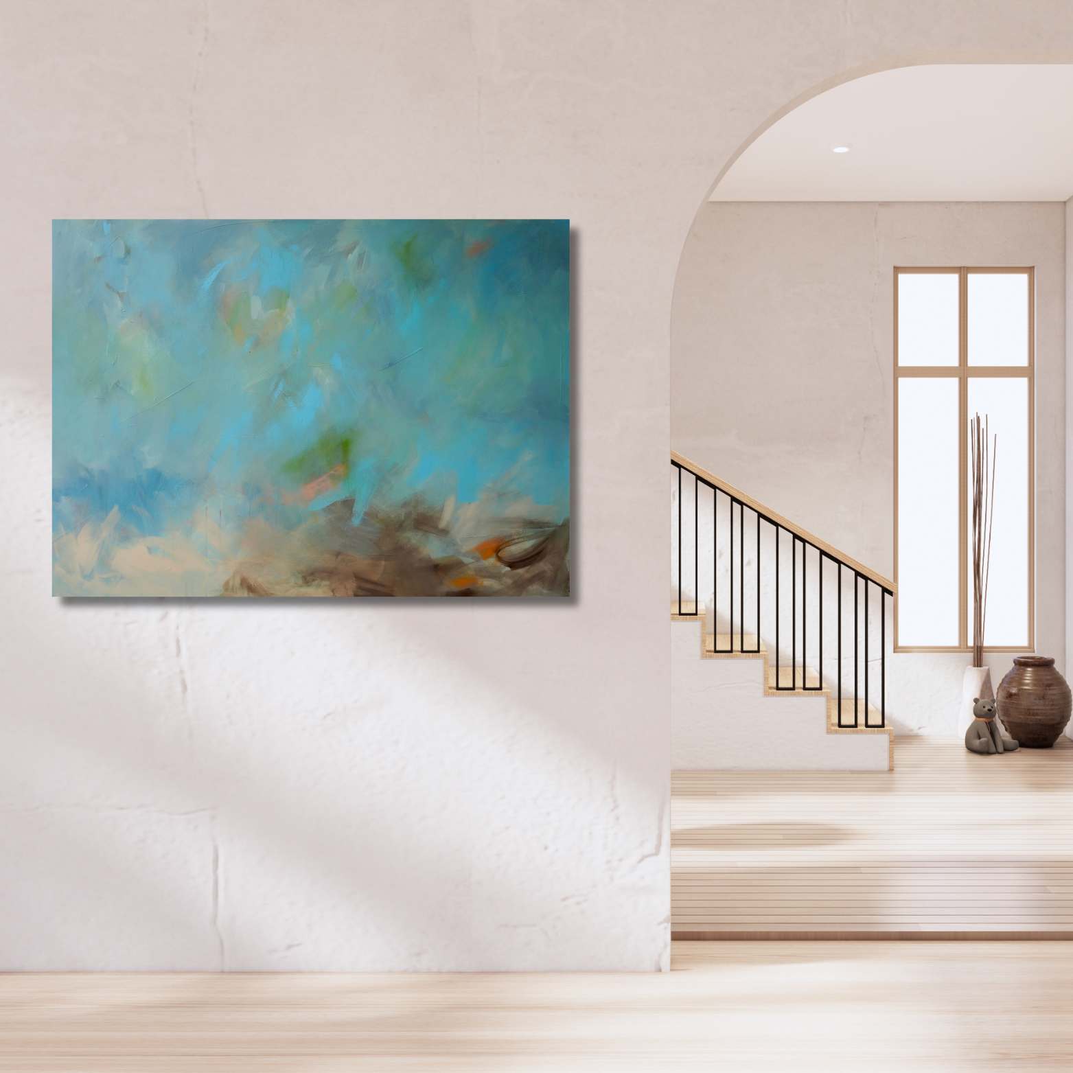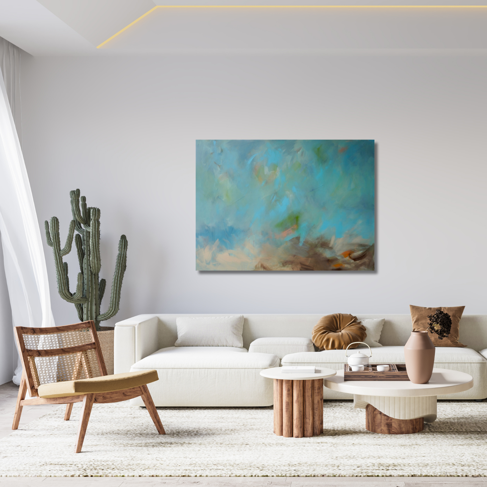 Heaven and Earth is a bold abstract expression that explores the dynamic balance between the grounded and the divine, the seen and the felt. Warm earth tones anchor the lower portion of the canvas, evoking soil, stone, and the visceral sense of being grounded. Rising above, ethereal blues and blue-greens stretch skyward, lifting the eye and the spirit toward the expansive unknown. This ascending palette speaks to the sensation of elevation—of transcendence—while still being held by the grounding energy below.