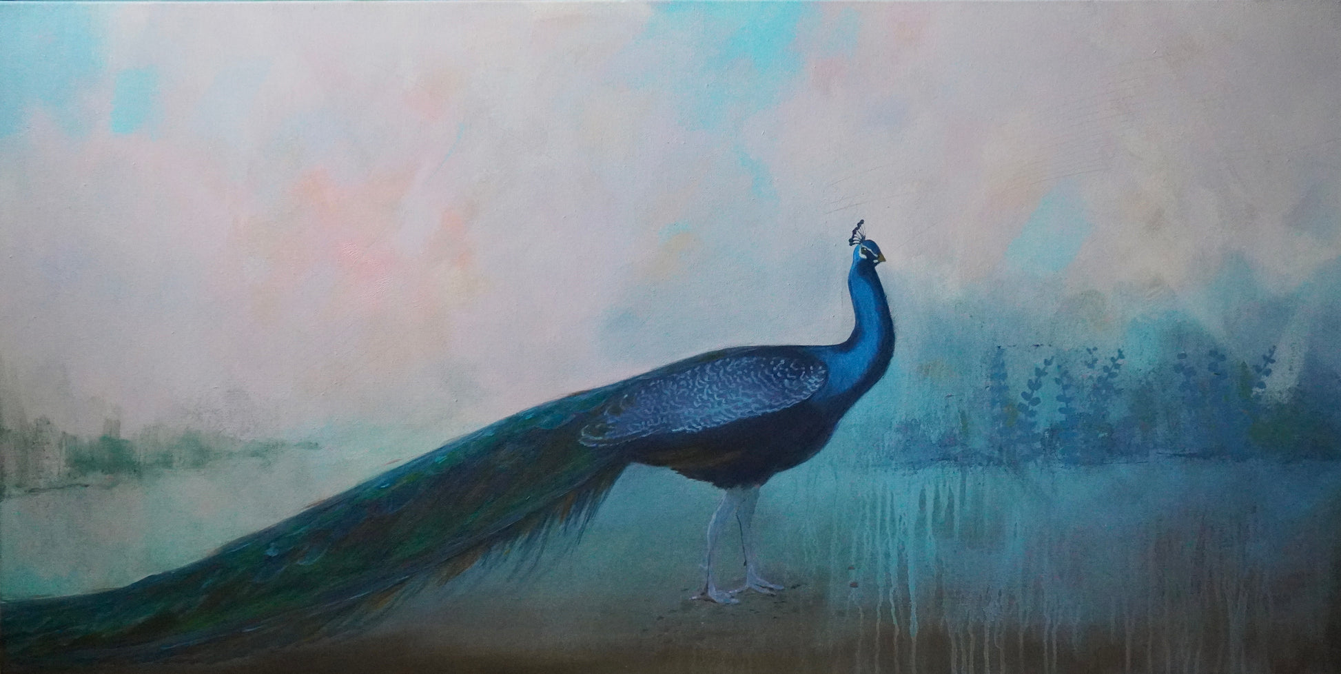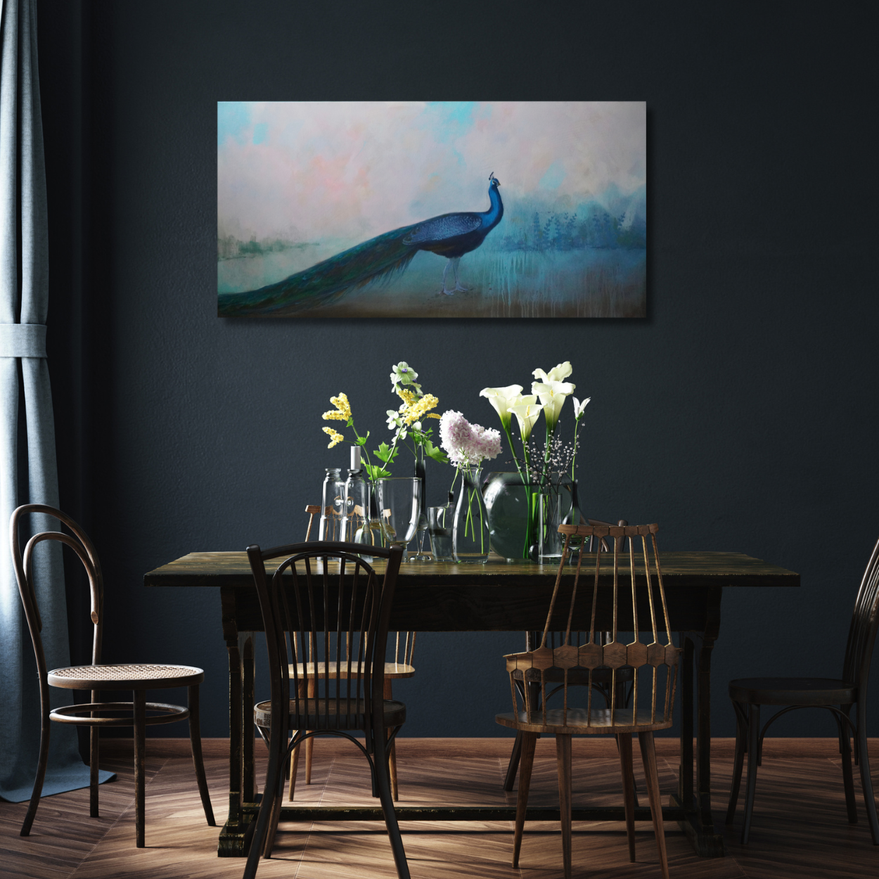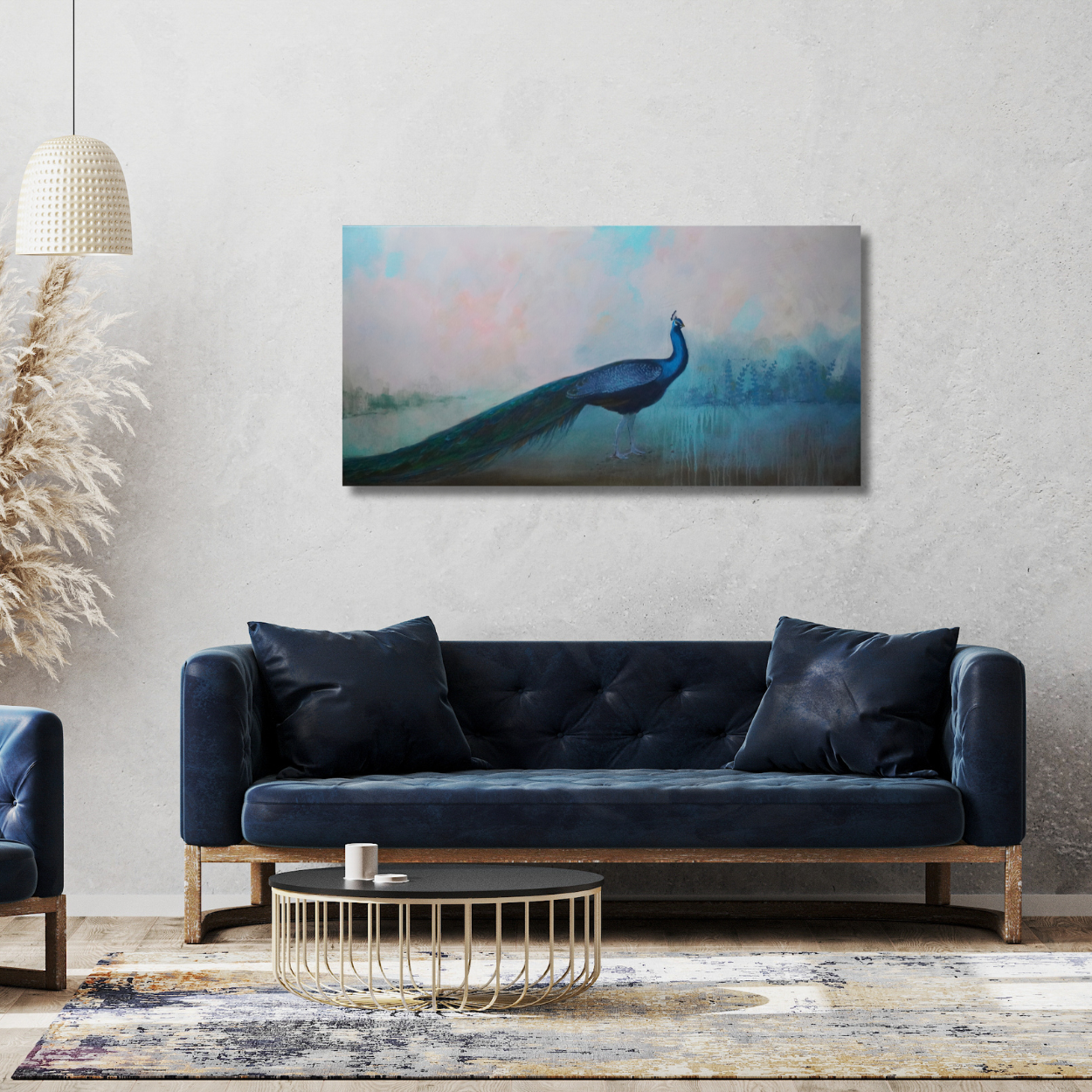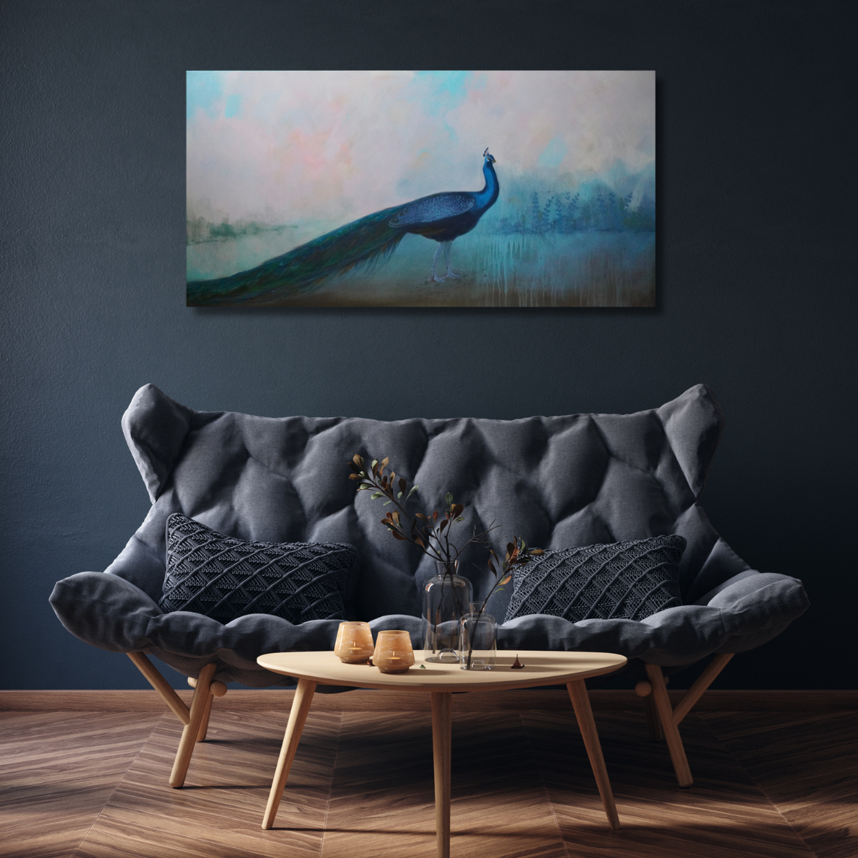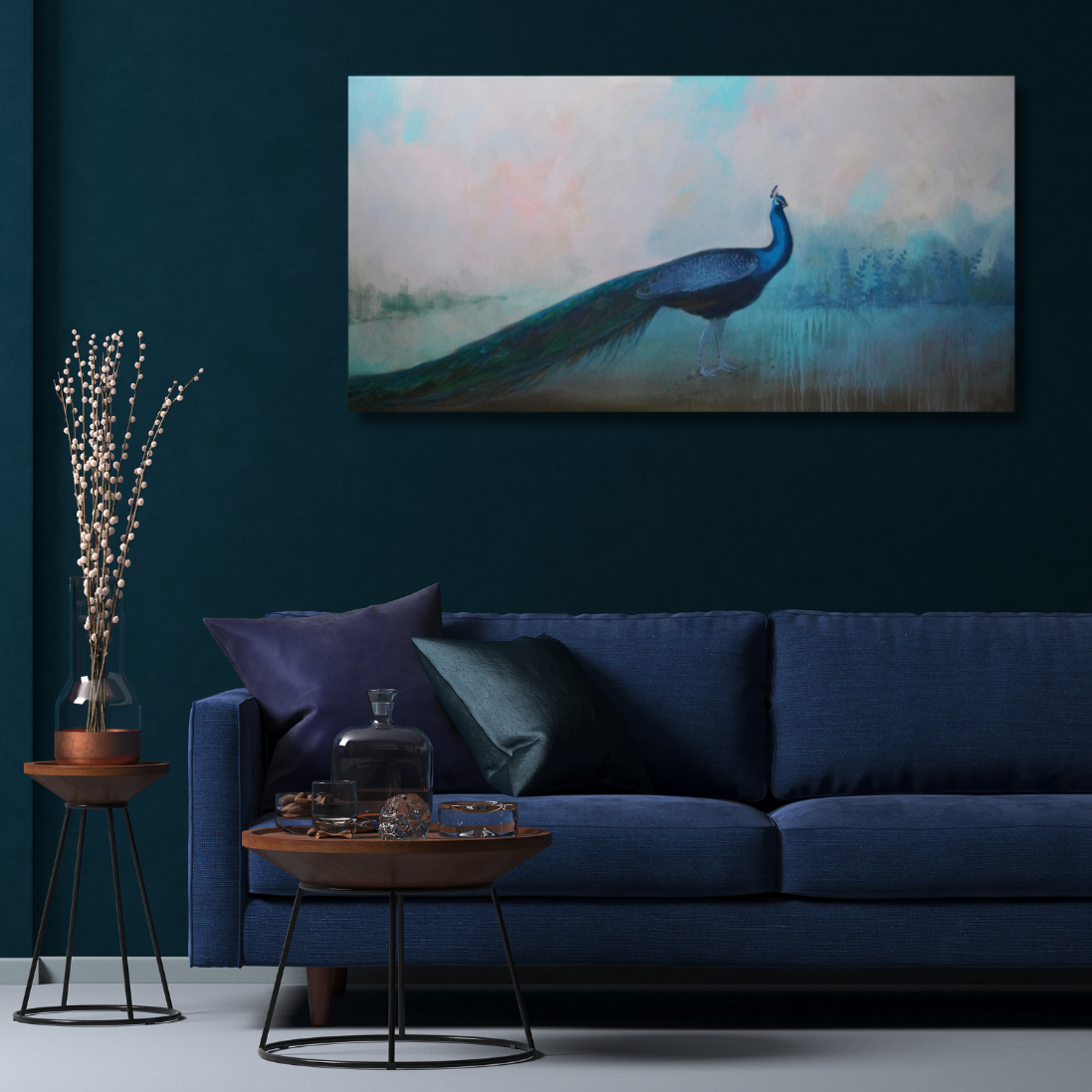 A peacock in rich dark blues and soft coal tones takes centre stage in this piece — elegant, grounded, and unapologetically bold. Mother Nature’s Dressing Room is a tribute to beauty in its most authentic form. It reminds us that true confidence comes from within, and that the natural world expresses magnificence without trying to impress.