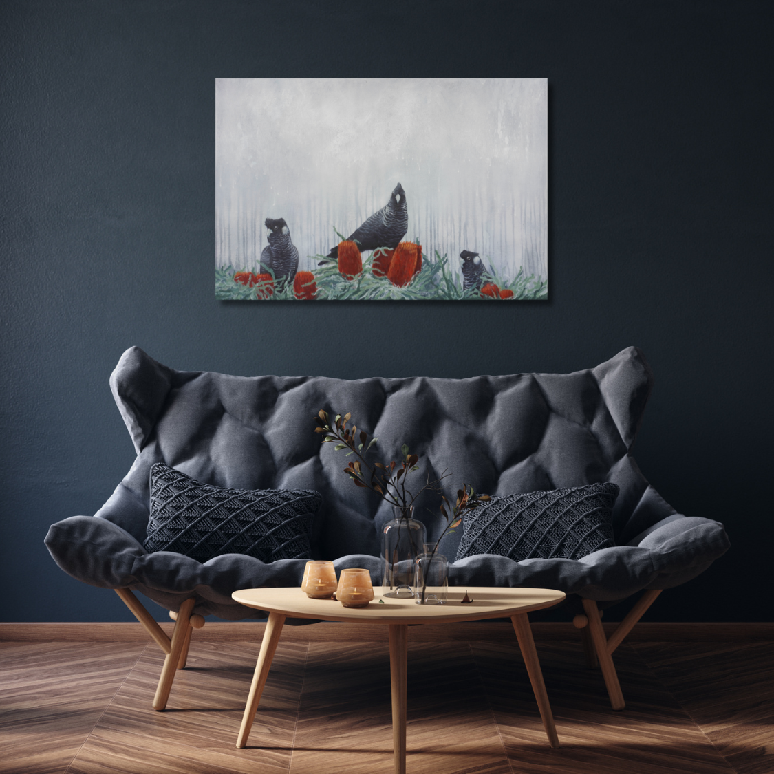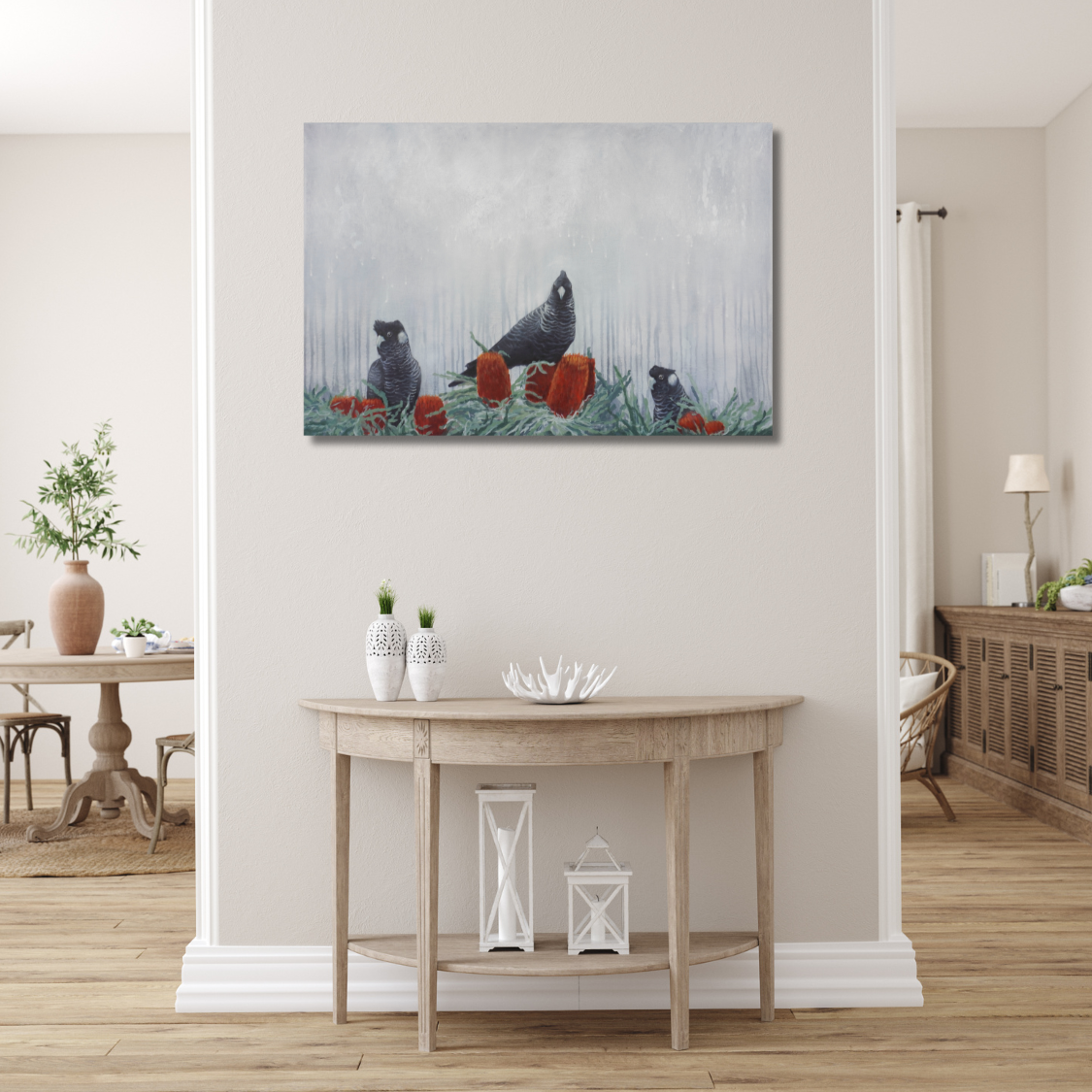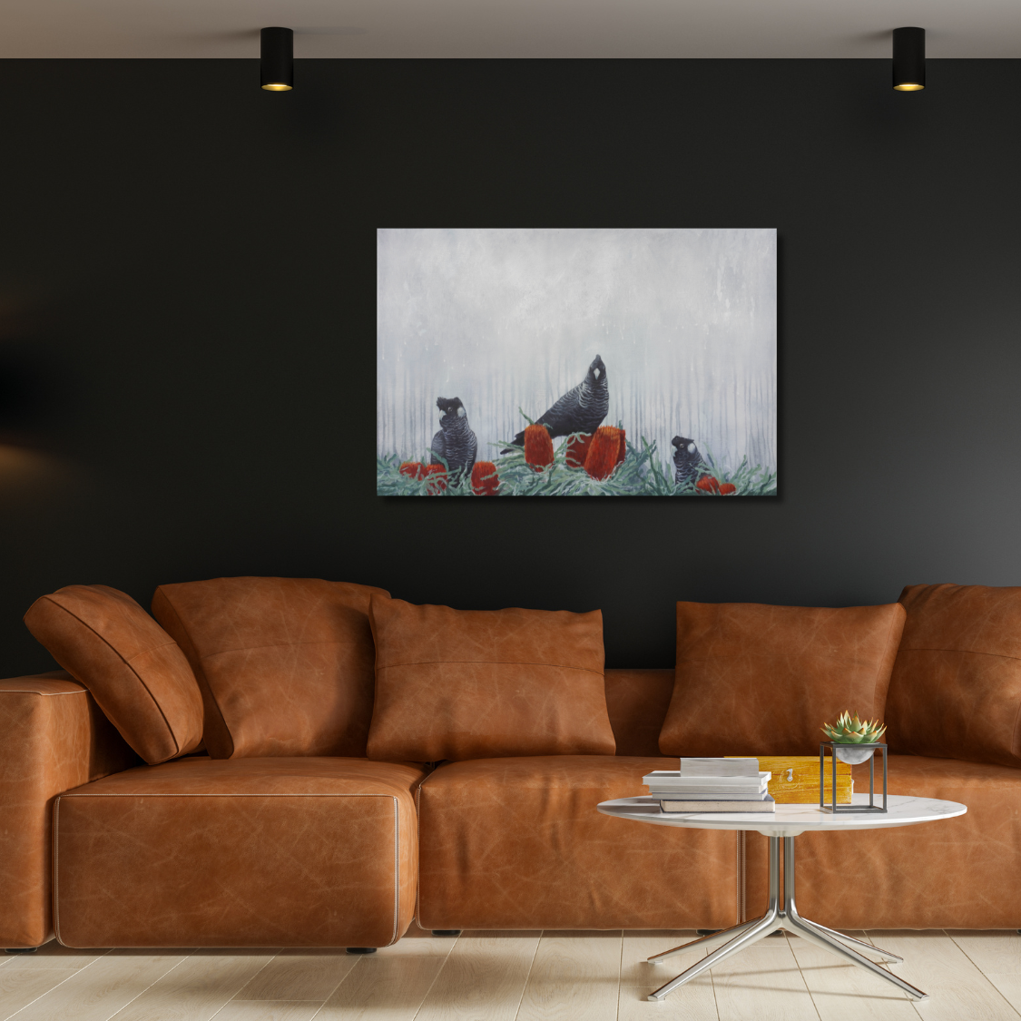 Trinity is a bold and evocative artwork featuring three Black Carnaby Cockatoos — a species rich in cultural and spiritual symbolism. Known not only for their striking presence, these birds are often seen as messengers between realms, carrying wisdom and guidance from ancestral spirits. Their piercing calls are considered both a warning and a voice of ancient protection.