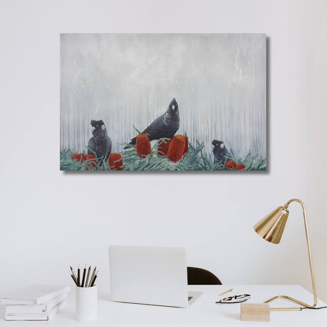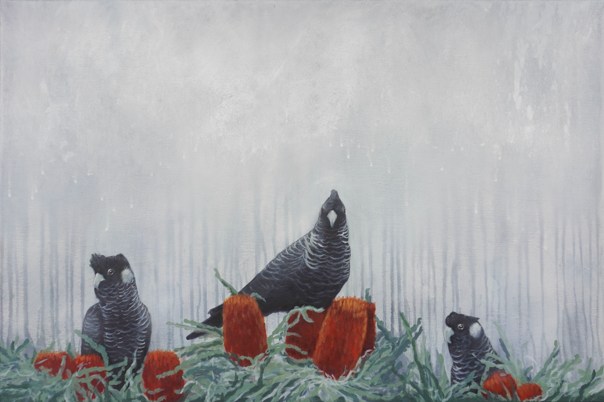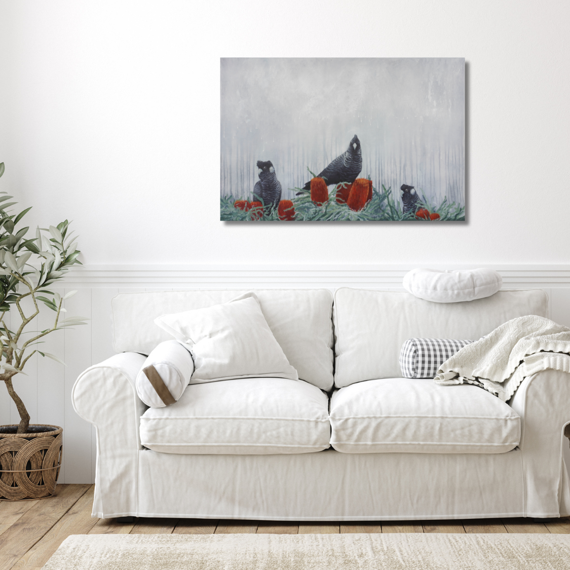 Trinity is a bold and evocative artwork featuring three Black Carnaby Cockatoos — a species rich in cultural and spiritual symbolism. Known not only for their striking presence, these birds are often seen as messengers between realms, carrying wisdom and guidance from ancestral spirits. Their piercing calls are considered both a warning and a voice of ancient protection.